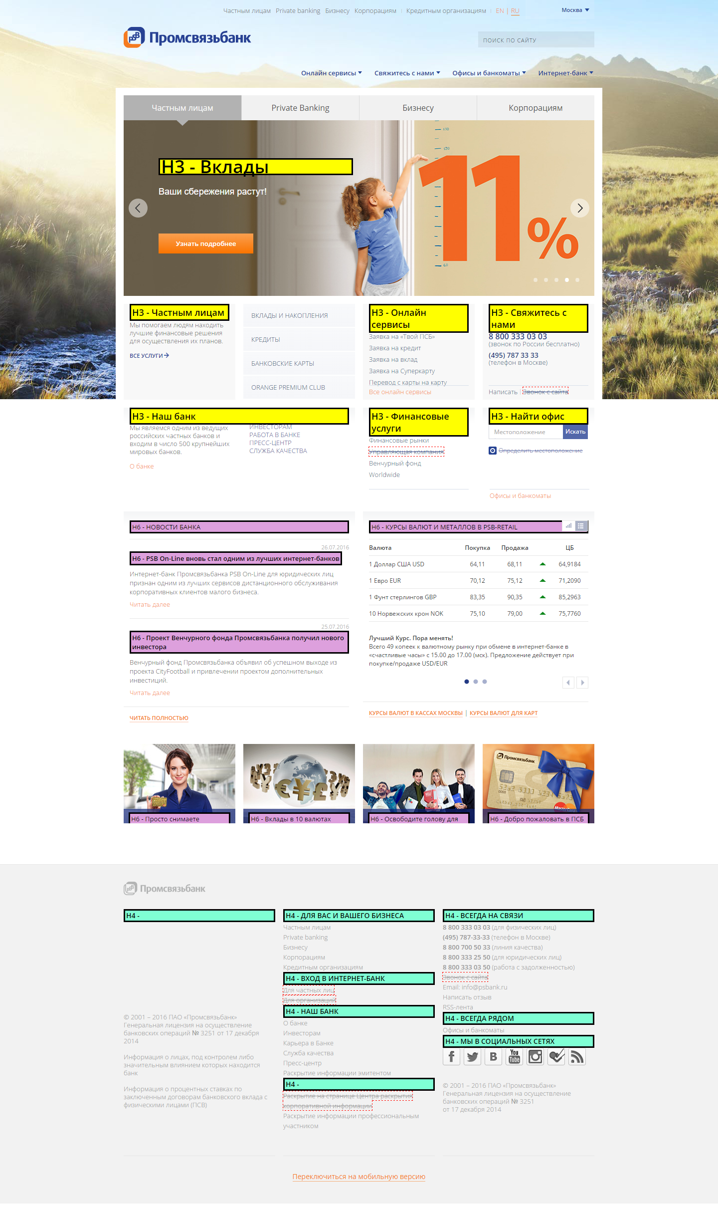 | Подсветка h1-h6 / strong / b / em | Выделяет и подсвечивает все h1-h6 заголовки, теги strong, b и em (кроме скрытых в display:none). Повторный вызов скрипта убирает все изменения на странице. Объединенный вариант двух предыдущих скриптов. |