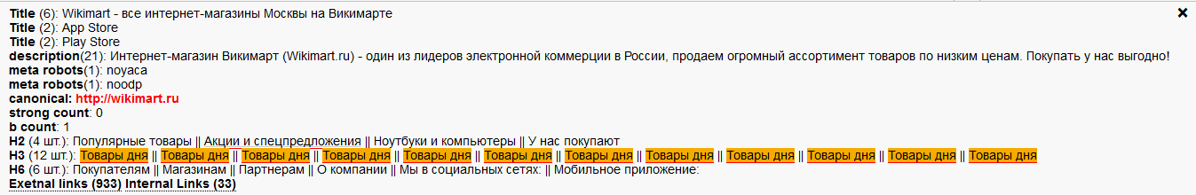 | robots.txt + meta | Проверяет, закрыта ли страница от индексации в файле robots.txt (проверка осуществляется через регулярные выражения для роботов Yandex и *) или meta-тегом (проверяются роботы yandex, googlebot, robots). Дополнительно проверяется, является ли страница канонической (если не является - то указывается канонический URL). |
